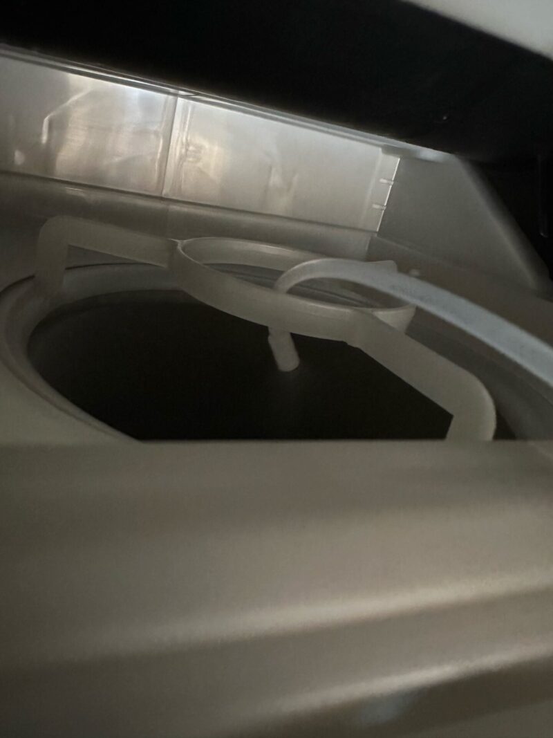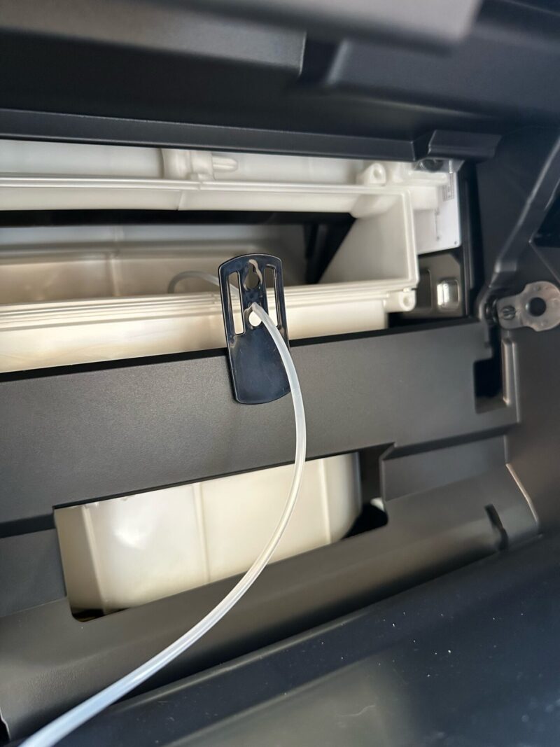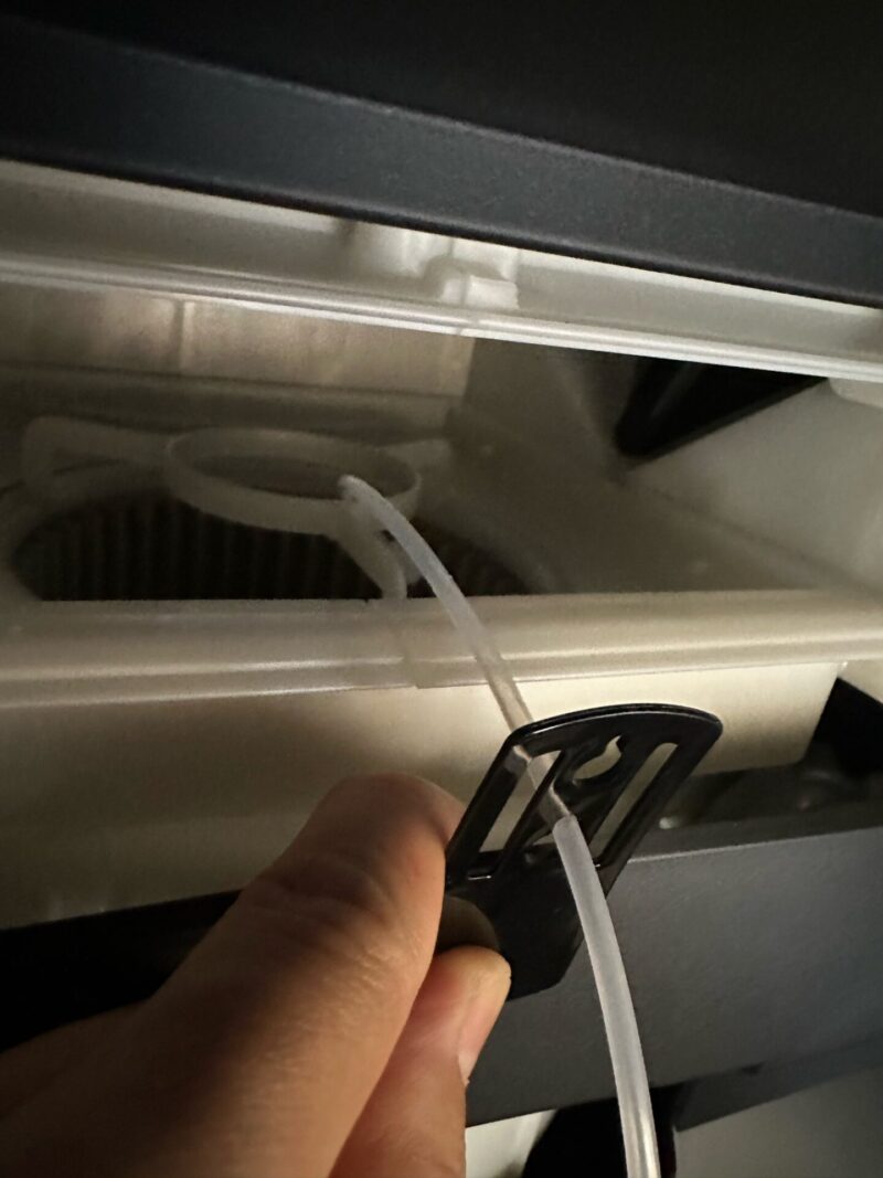 ホースを接続したら一度固定具にホースを固定してみてシロッコファンまでの距離を確認します。この時はまだ固定具の両面テープは剥がさない方がいいです。