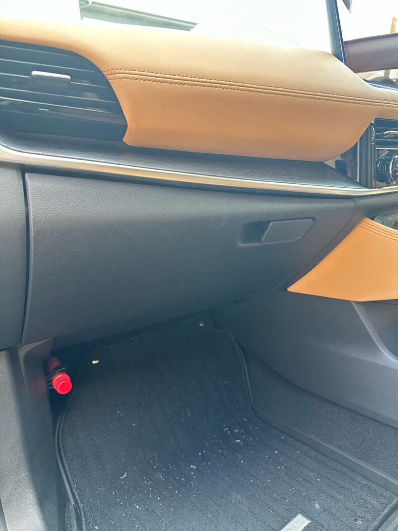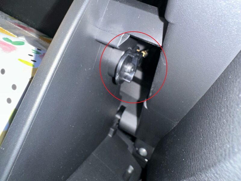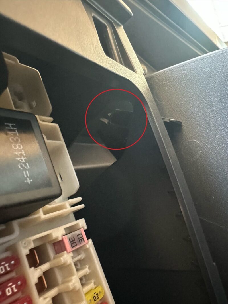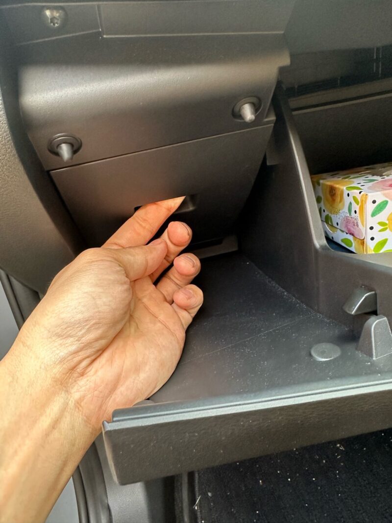次にグローブボックスを開けます。左側はヒューズボックスの蓋を開けるとポッチを押しやすいです。右側は軽く開閉できる用に巻き取り紐がついているのでそれも外します。