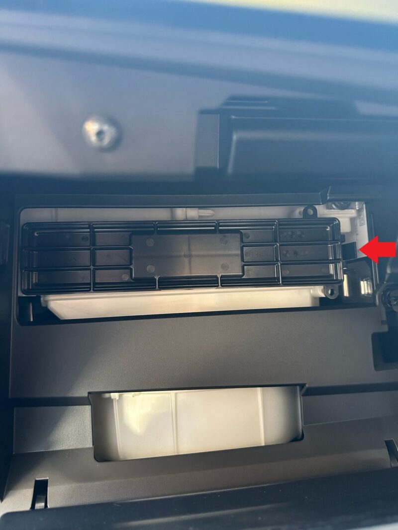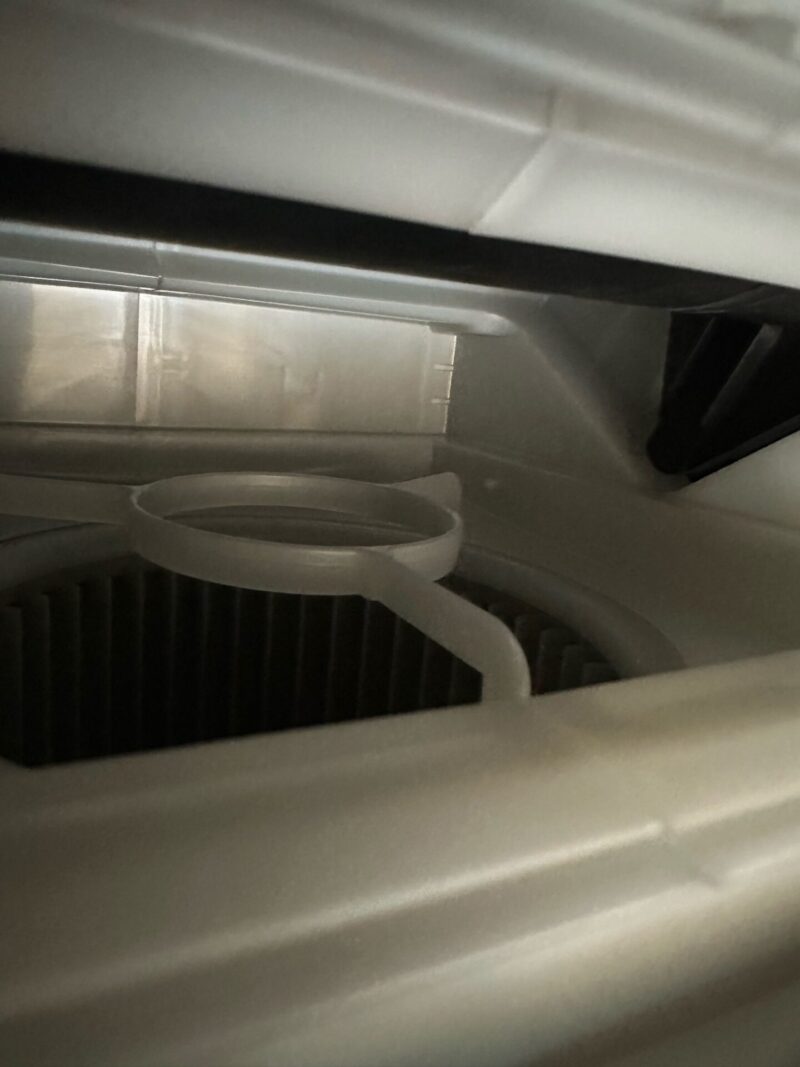 そしたらこんな感じでエアコンフィルターにアクセスしやすくなります。エアコンフィルターのカバーは右の爪を挟みながら手前に引くと開いてきます。左側は差し込みがあるので右にスライドしたらフィルターカバーが外れます。外れたらフィルターを抜き取ってください。
