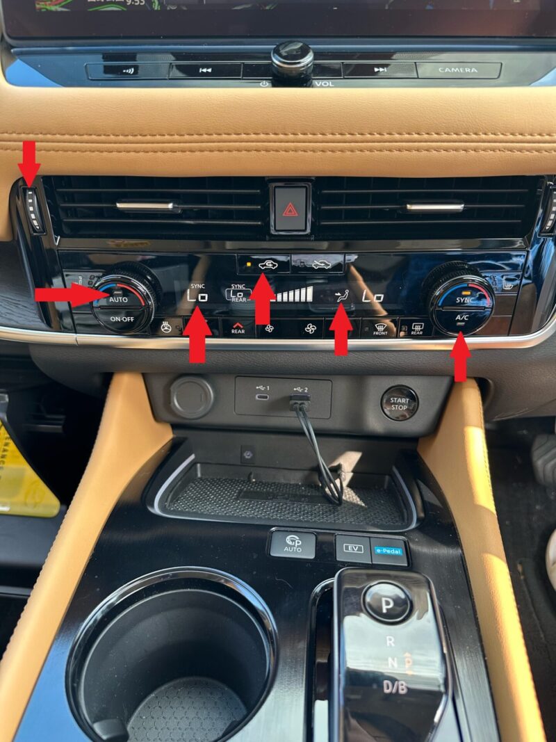 スプレーの準備ができたら次は車のエアコンの設定をします。送風は前方に設定、内気循環に設定、A/CとAUTOモードはoff、温度は一番下、風量は全開、全ての吹き出し口を全開にします(リア側も忘れずに)。
