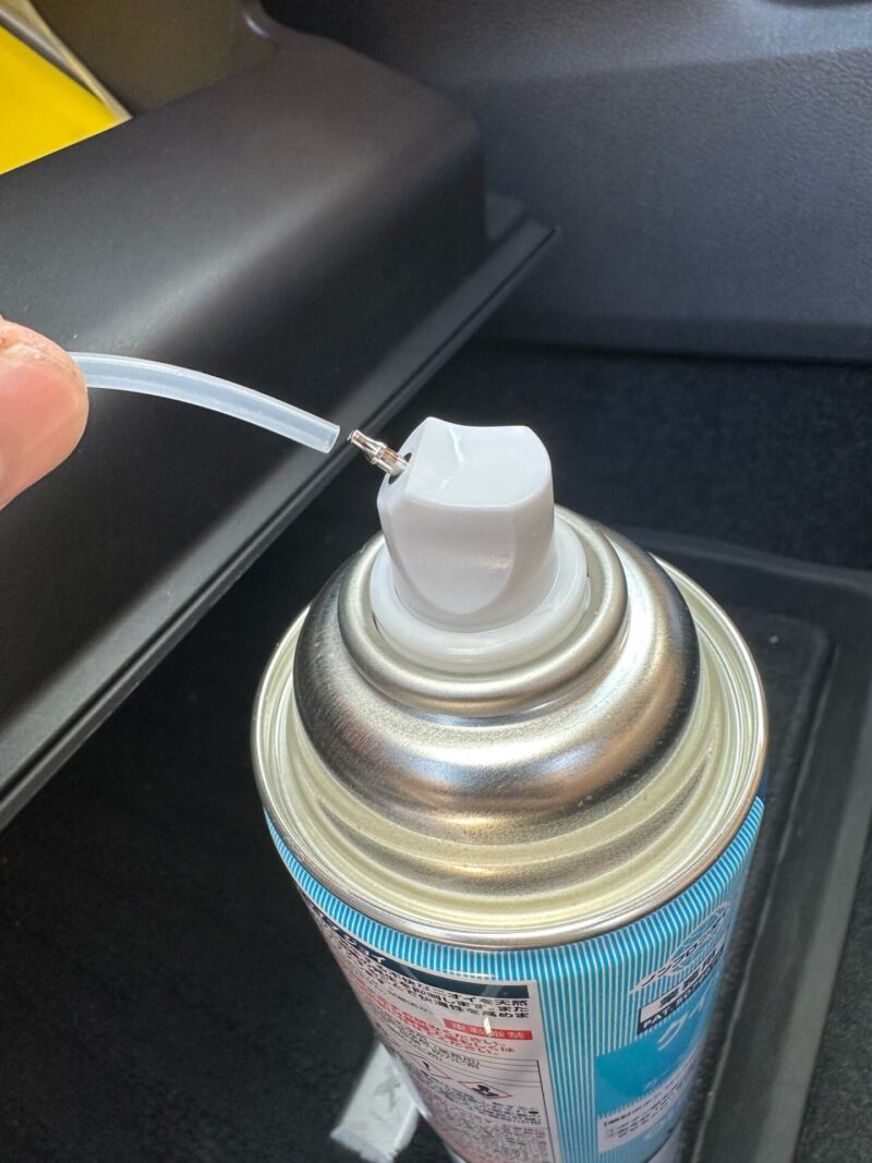 エアコンの設定ができたら薬剤を噴射します。スプレー缶は垂直にしたまま噴射ボタンを押しながら缶を150度ほど回転させると噴射ボタンが押したままのロック状態になります。ちゃんと薬剤が噴射されている事を確認してそのまま約3分放置、、、