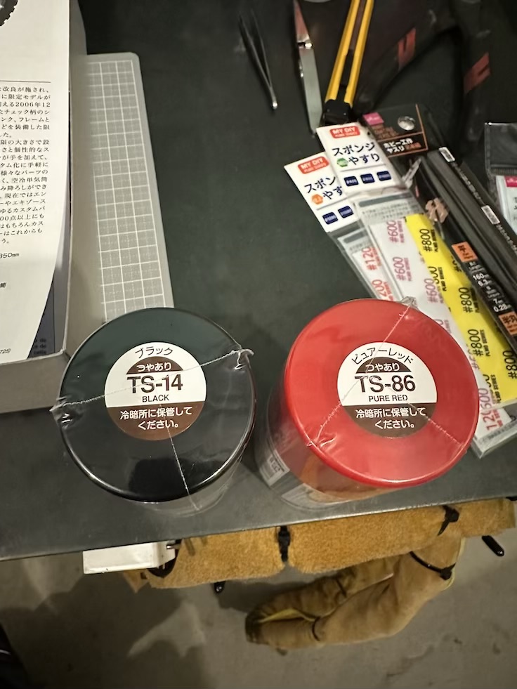 プラモデル本体以外に接着剤とか塗料が必要なキットなんで今回は下記を使用して製作しました。(売り切れとかやったんでタミヤ指定の色と違うんで注意してください)買うときにフラットって書いてあるのはつや消しなんで注意してください!レオシュガの父は間違ってフラットレッドを1個買ってしまった、、、