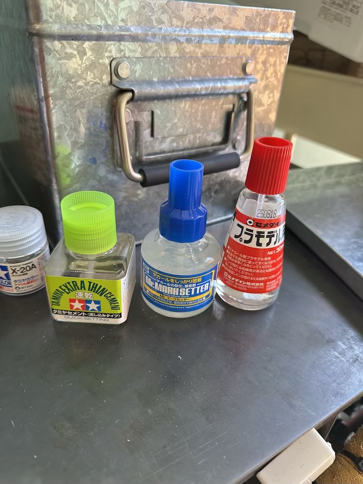 速乾タミヤセメント(流し込みタイプ)、セメダインプラモデル用接着剤、ミスターホビーMrマークセッター