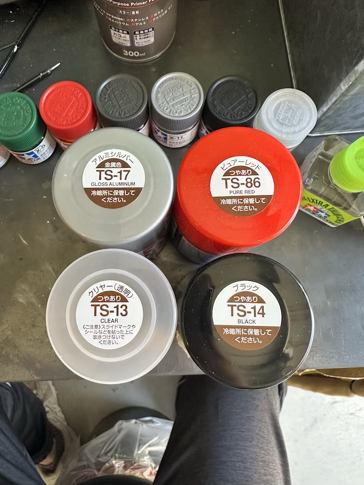 TS-13クリヤー(透明)つやあり、TS-14ブラック(つやあり)、TS-17アルミシルバー(金属色)TS-86ピュアーレッド(つやあり)